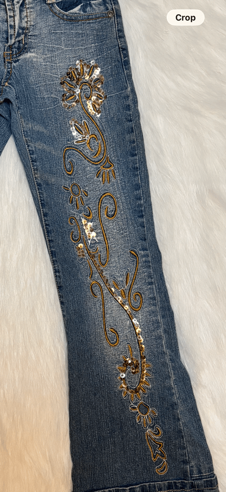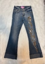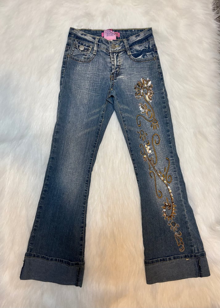 Features gold floral embroidery, sequin details, a lightly distressed wash, and cuffed hems for the full early-2000s look. Perfect for school outfits, photos, and Bratz-inspired style.